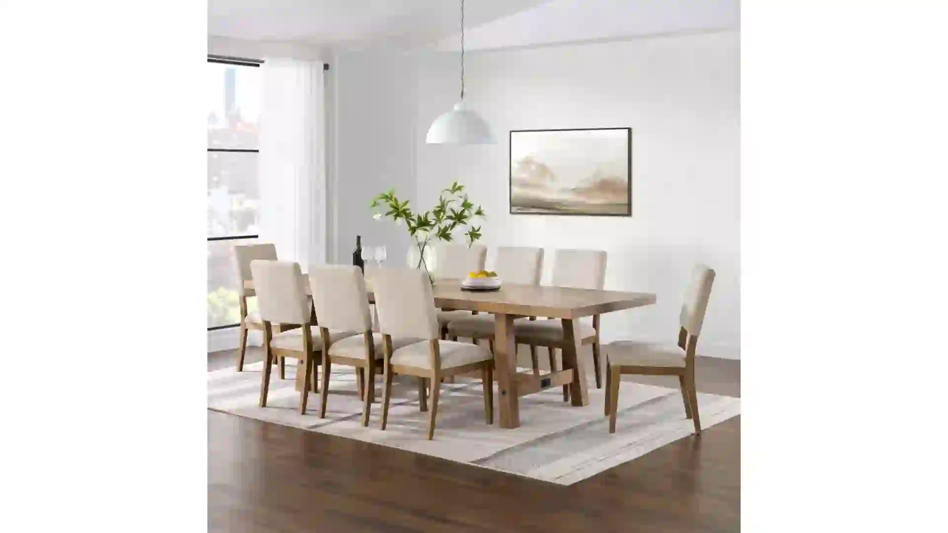 If you like entertainment, you’ll love this graham dining table. It seats eight beige-upholstered chairs and has an 18-inch removable leaf beneath the table, so you can modify the length of the table to suit your needs. Whether you’re hosting a family dinner or a casual barbecue, this table will welcome everyone.