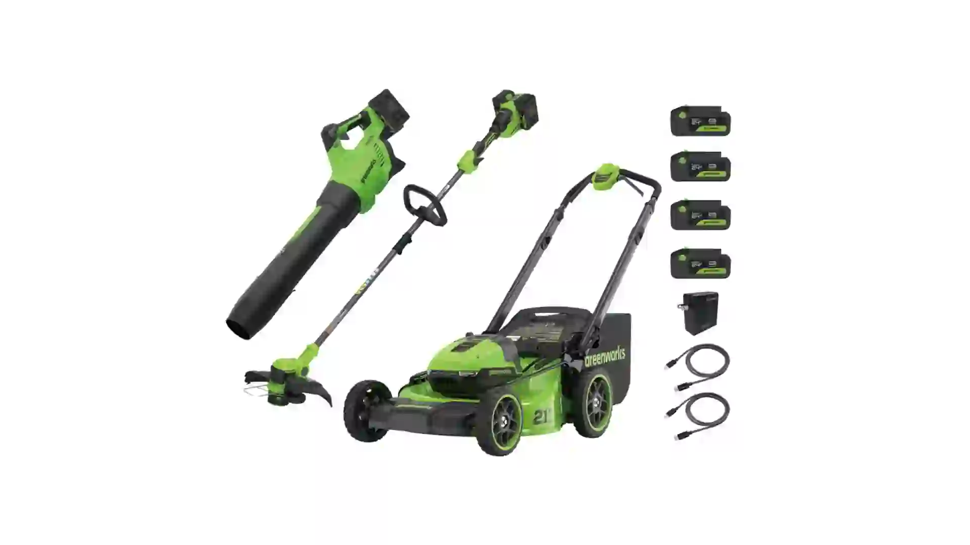 With more time to work on the lawn around the corner, now is a good time to upgrade your lawn care tools Greenworks Mower, Trimmer and Blower Combo Kit. Handle all maintenance of your yard from mowing the grass to blowing leaves to pruning chores. In addition to the tools, this kit comes with four batteries, six single line auto-feed replacement spools, a fast charger, and two braided nylon charging cables.