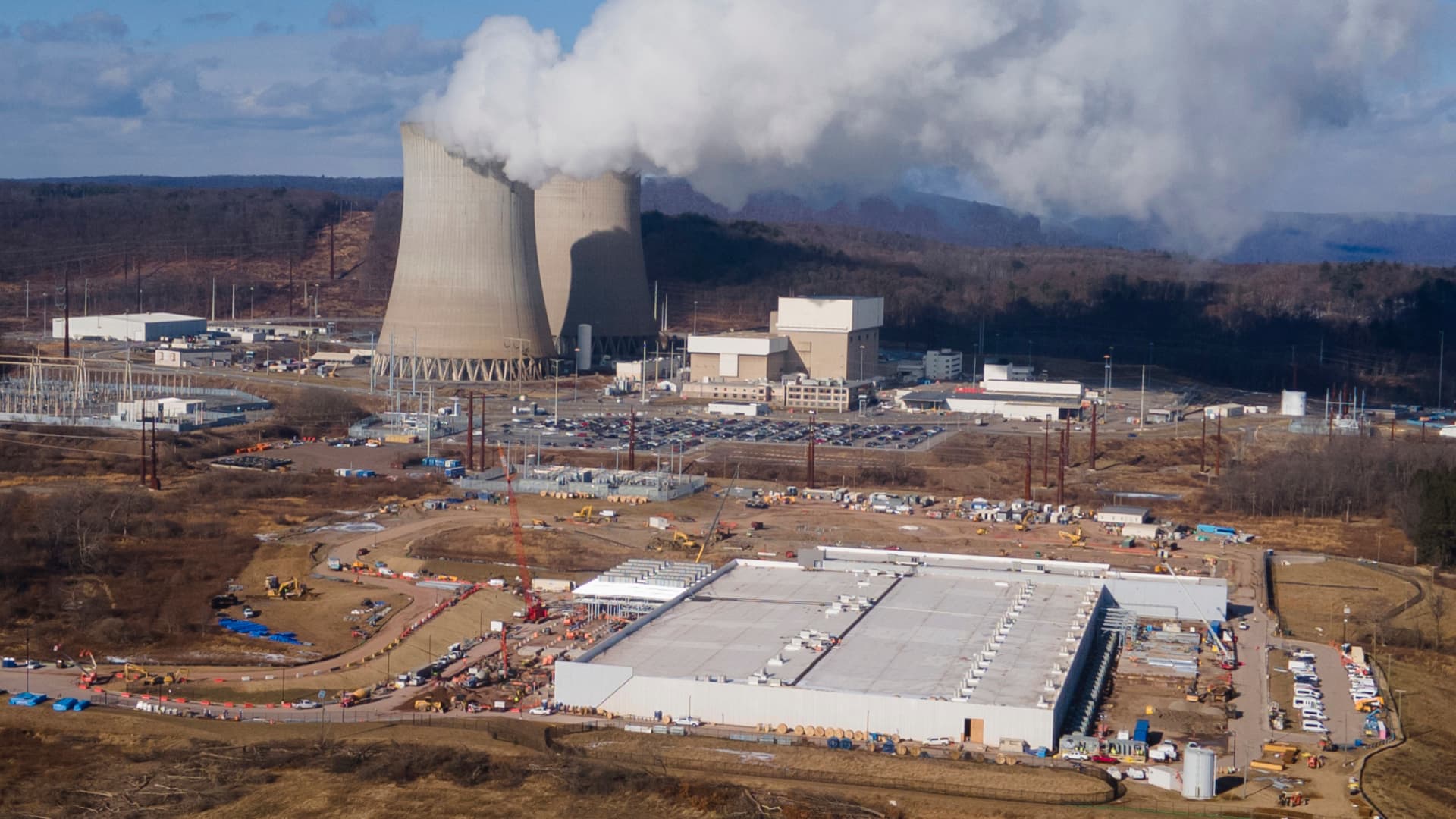 A data center owned by Amazon Web Services, front right, is under construction next to the Susquehanna Nuclear Power Plant in Berwick, Pennsylvania, on January 14, 2025.