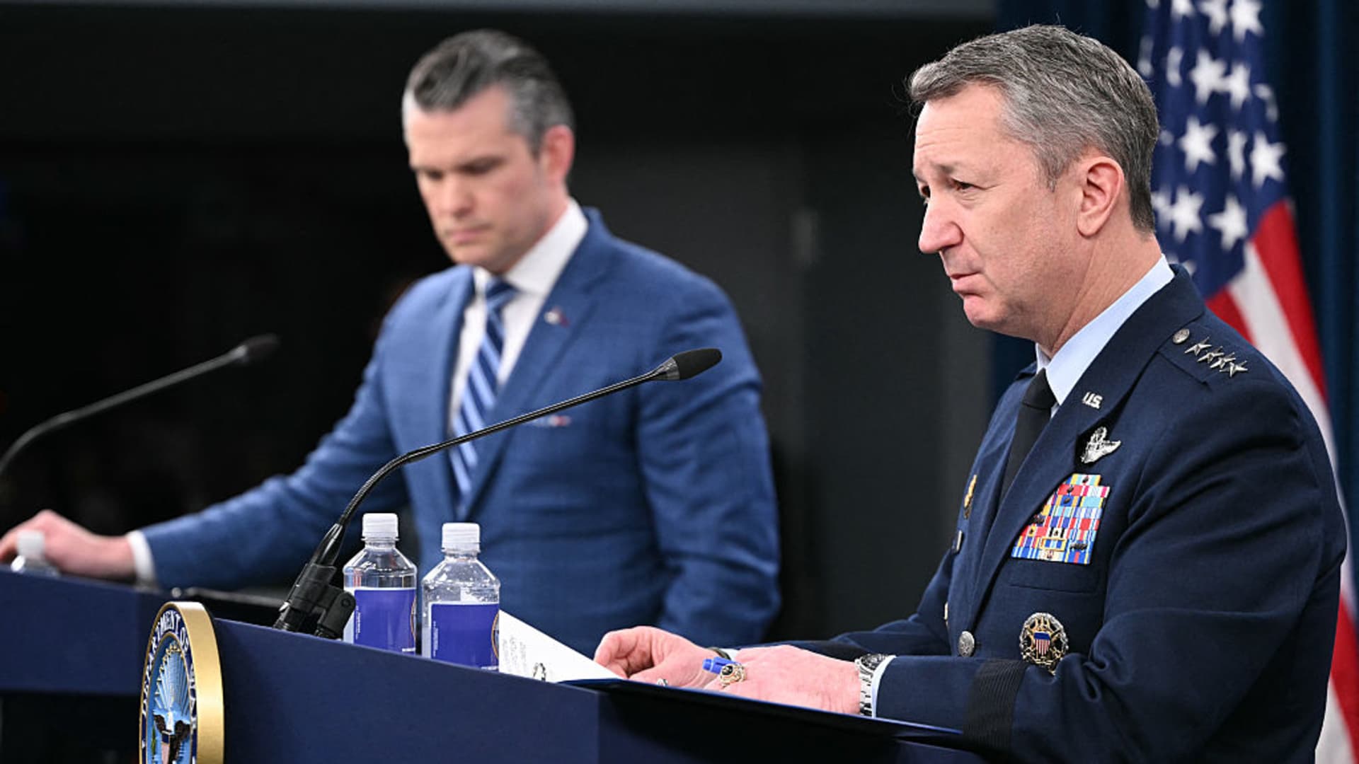 (Left to right) U.S. Defense Secretary Pete Hegseth speaks as Chairman of the Joint Chiefs of Staff Gen. Dan Kaine speaks during a press briefing at the Pentagon in Washington, DC, on April 8, 2026.