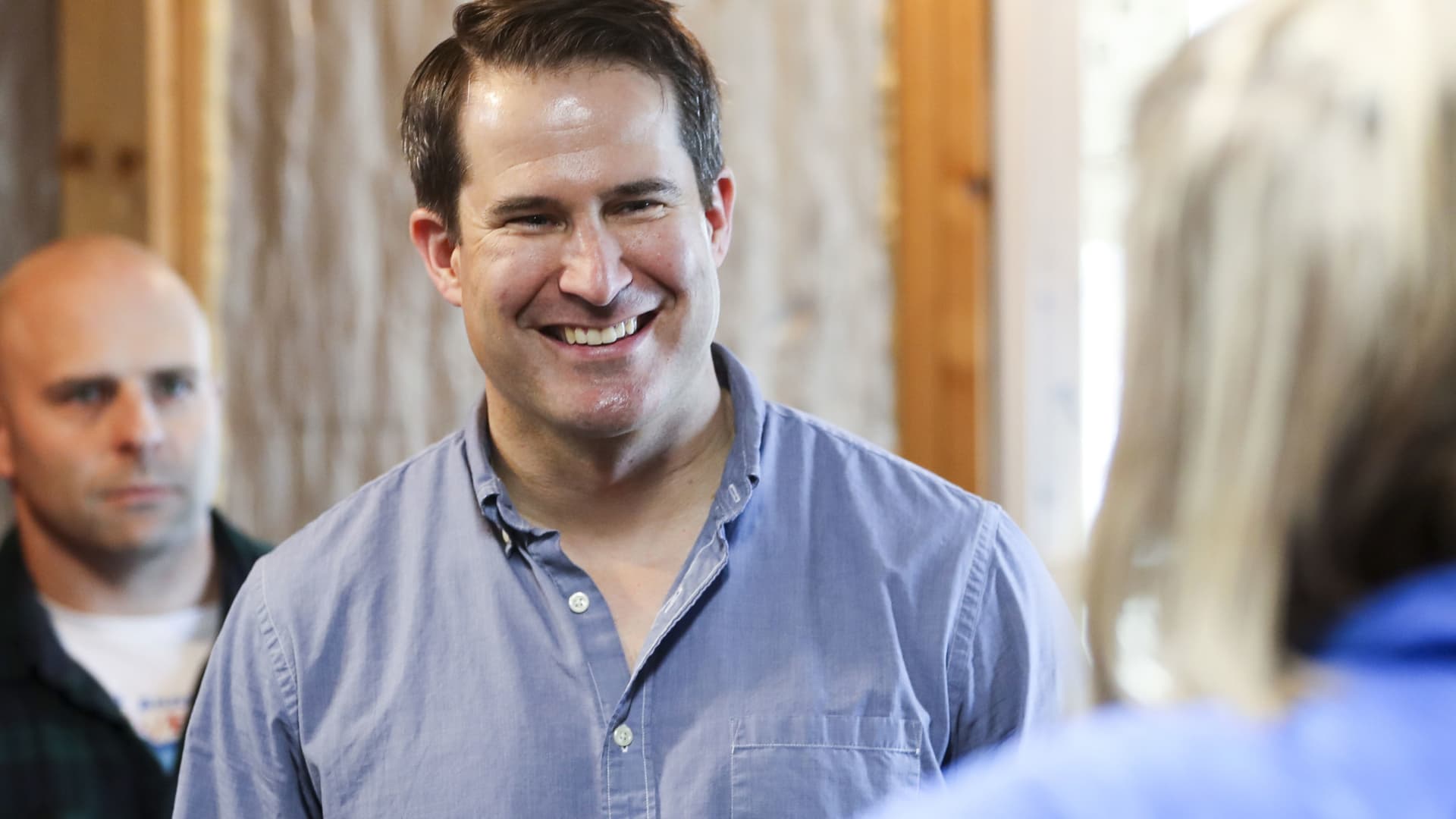 Representative Seth Moulton, a Democrat from Massachusetts and 2020 presidential candidate, meets with volunteers during a campaign stop in Manchester, New Hampshire, on Tuesday, April 23, 2019.