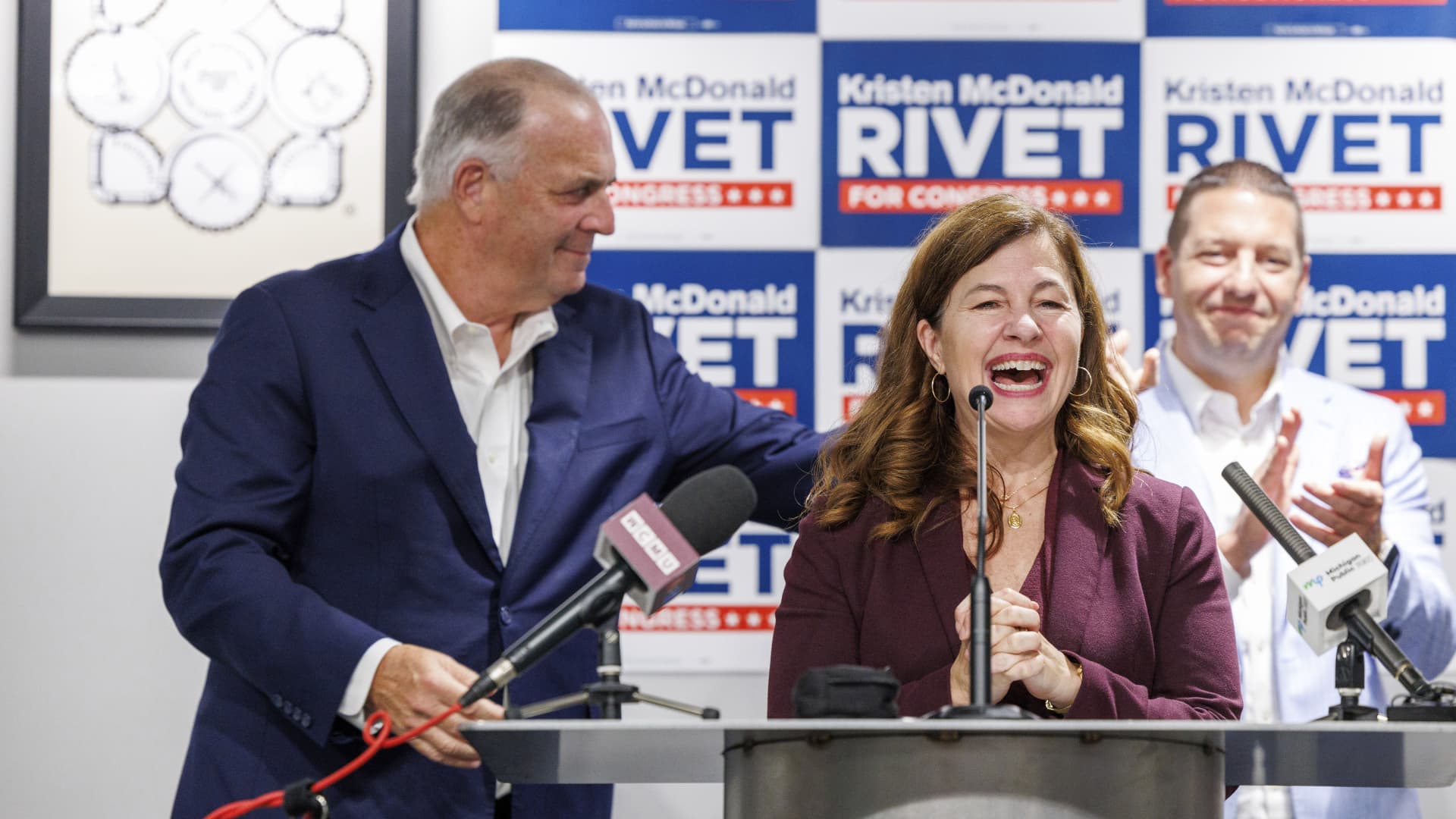 State Senator Kristen McDonald Rivet addresses supporters of her campaign for Congress during a primary election night vigil party on August 6, 2024 in Saginaw, Michigan.